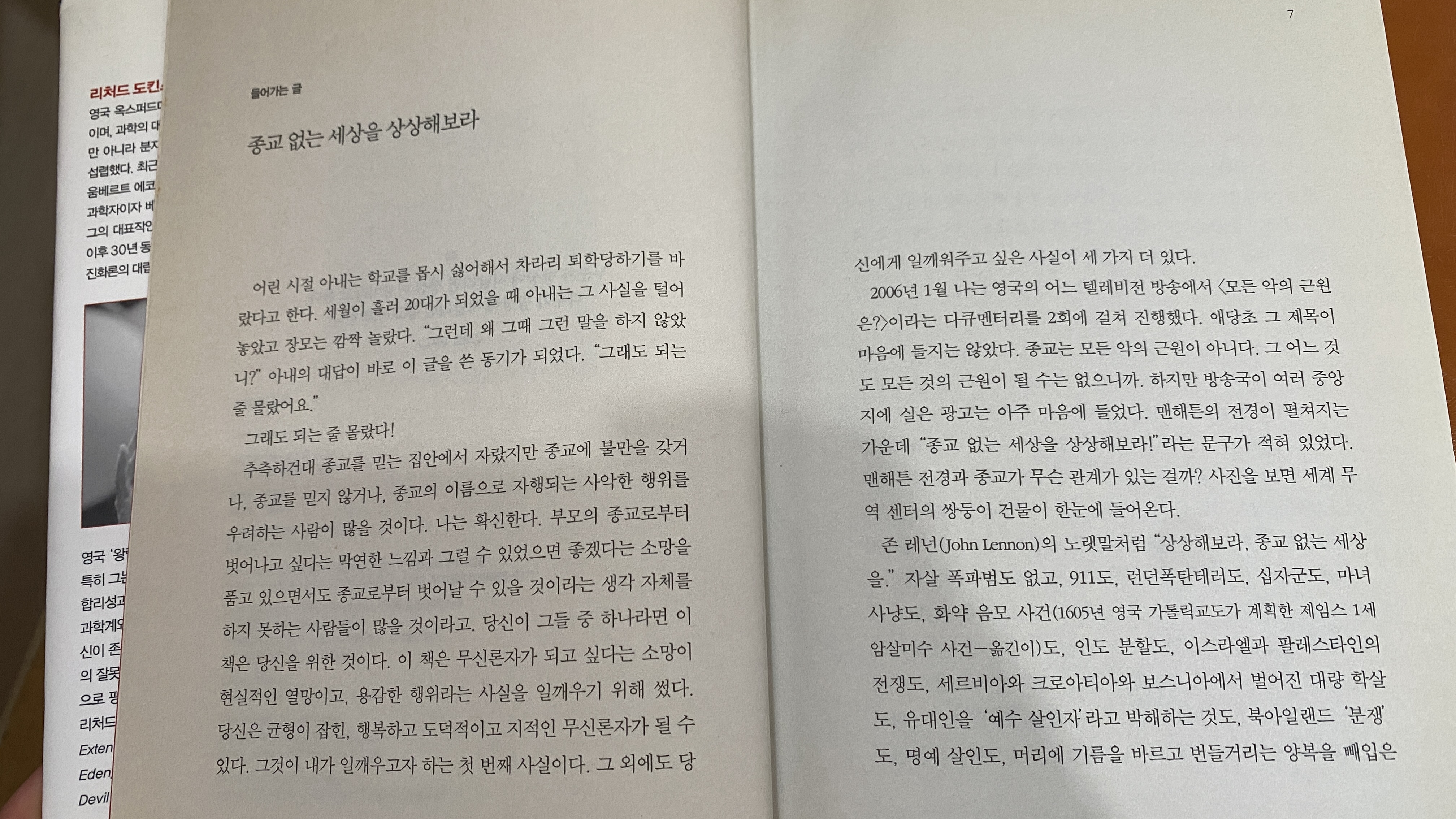 개인적으로 도킨슨 작가의 거의 모든 주장에 대해 동의하지만, 작가가 얘기하는 것처럼 비겁하게 종교에 대해서 정면으로 비판하지는 않는다. 하지만, 영국은 기독교와 국가가 법적으로 분리되어 있지 않아서 종교적인 갈등이 심하고, 미국이나 한국은 세속주의와 종교의 자유가 있지만 기독교의 힘이 너무 강해서 종교가 정치나 사회에 깊이 관여하며 이라크 침략 전쟁을 '성전'이라고 부르거나 성서나 경전에 대한 맹목적 믿음을 강요하는 능력을 제외하면 모든 면에서 문맹에 가까운 사람들에게 국정에 대한 충고와 방향을 듣고 도시와 국가를 자신의 신에게 바친다고 말하는 정신나간 대통령이나 정치인들을 보는 것과 주변에서 지속적으로 종교에 대해서 강요하거나 집요하게 추천을 당하는 것은 확실히 강한 스트레스를 받는 일이며 종교에 대해서 더욱 더 적대적이게 만들기도 한다. 중국에 살면서 가장 좋은 점 중 하나도 종교가 사실상 없는 사회여서 그런 스트레스가 없다는 것이다. 사실 중국에도 종교 선택의 자유는 있지만, 포교활동이나 공공장소에서 종교적 활동은 법적으로 금지되어 있다. 아마 이런 종교와 사회 완전 분리나 종교의 고립주의가 바로 도킨슨 작가가 원하는 것이 아닐까 싶기도 하다.