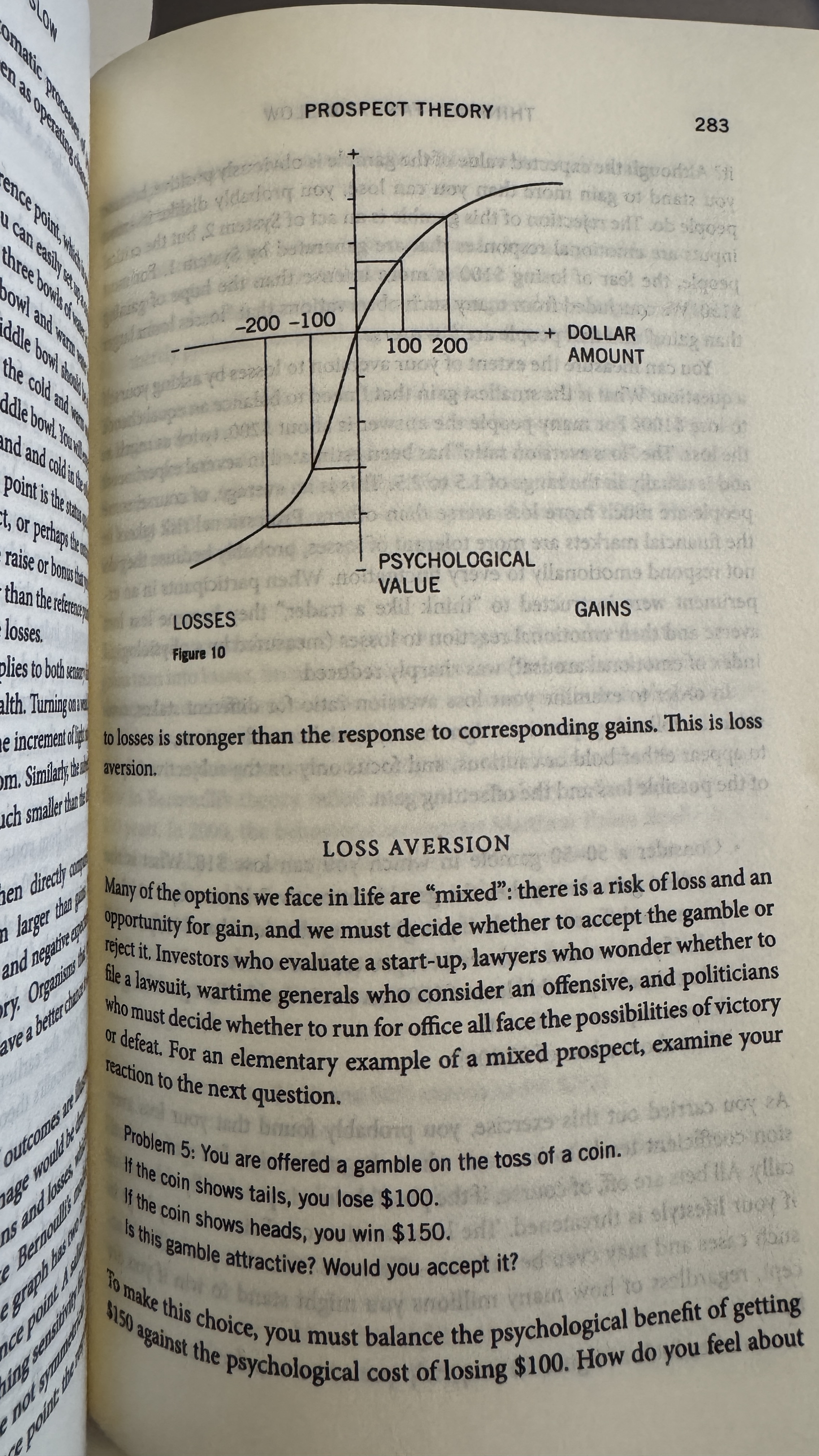 - 이 파트에서 카너먼 교수는 자신의 전망이론(Prospect theory)에 대해서 설명한다. 기존 고전 경제학의 근간이 베르누이의 효용이론의 설명과는 다르게 경제학적으로도 인간은 논리적으로 행동하지 않는다는 것을 보여준다. 예를 들어 임금의 증가나 하락에 대한 가치는 선형적이지 않고 비선형적이며 심지어 비대칭적이라는 것이다. 임금의 증가는 원점에서 가장 높은 기울기를 가지다가 증가값이 커질수록, 즉 아래 그래프에서 오른쪽으로 갈수록 그 가치가 증가하는 속도가 줄어들다가 어느 시점에 가면 더이상 변하지 않게 된다는 것이다. 그래서 연봉이 어느 일정수준이상으로 높아지면 연봉 상승에 따른 행복도의 증가가 의미없음을 설명하게 된다. 이와는 반대로 임금의 삭감에 따른 가치 손실은 증가보다 훨씬 큰 기울기를 보여준다. 그래서 사람들은 통계적으로는 상대적으로 적은 손실을 회피하기 위해 더 많은 노력과 지출을 하게 된다는 것이다.
