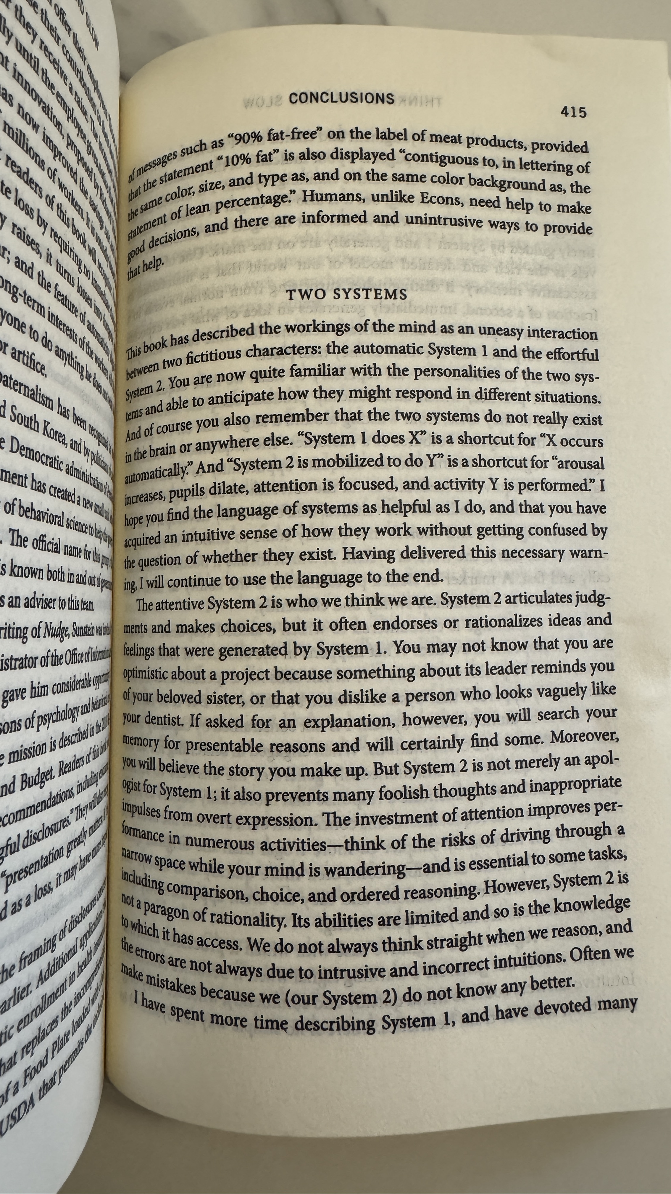 - 인간의 사고는 두 시스템으로 이루어져 있다고 볼 수 있다. 실제 물리적으로 두개의 시스템이 있는 것이라 아니라 성질이 매우 다른 두가지의 사고 시스템에 동작한다는 것이다. 이를 시스템 1과 시스템 2로 간단히 명명한다면, 시스템 1은 빠르게 작동하고 직관적이며 감정적이고 무의식적이다. 반면 시스템 2는 느리고 노력이 필요하며 논리적이고 계산적이며 의식적인 활동으로 작동한다고 말한다. 논리적인 사고는 시스템2가 작동을 해야 하지만 우리 일상생활의 거의 모든 부분에서 시스템 1이 작동하며 시스템 2는 매우 한정적으로 작동하기 때문에 인간의 사고는 대부분 비논리적이며 감정적이라고 말한다. 시스템 2를 사용하기 위해서는 의식적으로 사고의 매단계를 검증하면서 진행해야 하는데 이러한 행위는 제한적인 사고 에너지를 많이 소모하기 때문에 일상에서의 모든 반응과 사고에 있어서, 심지어 우리가 생각해서 대답한다고 느끼는 부분까지도 시스템 1이 작동하고 있다고 말한다.