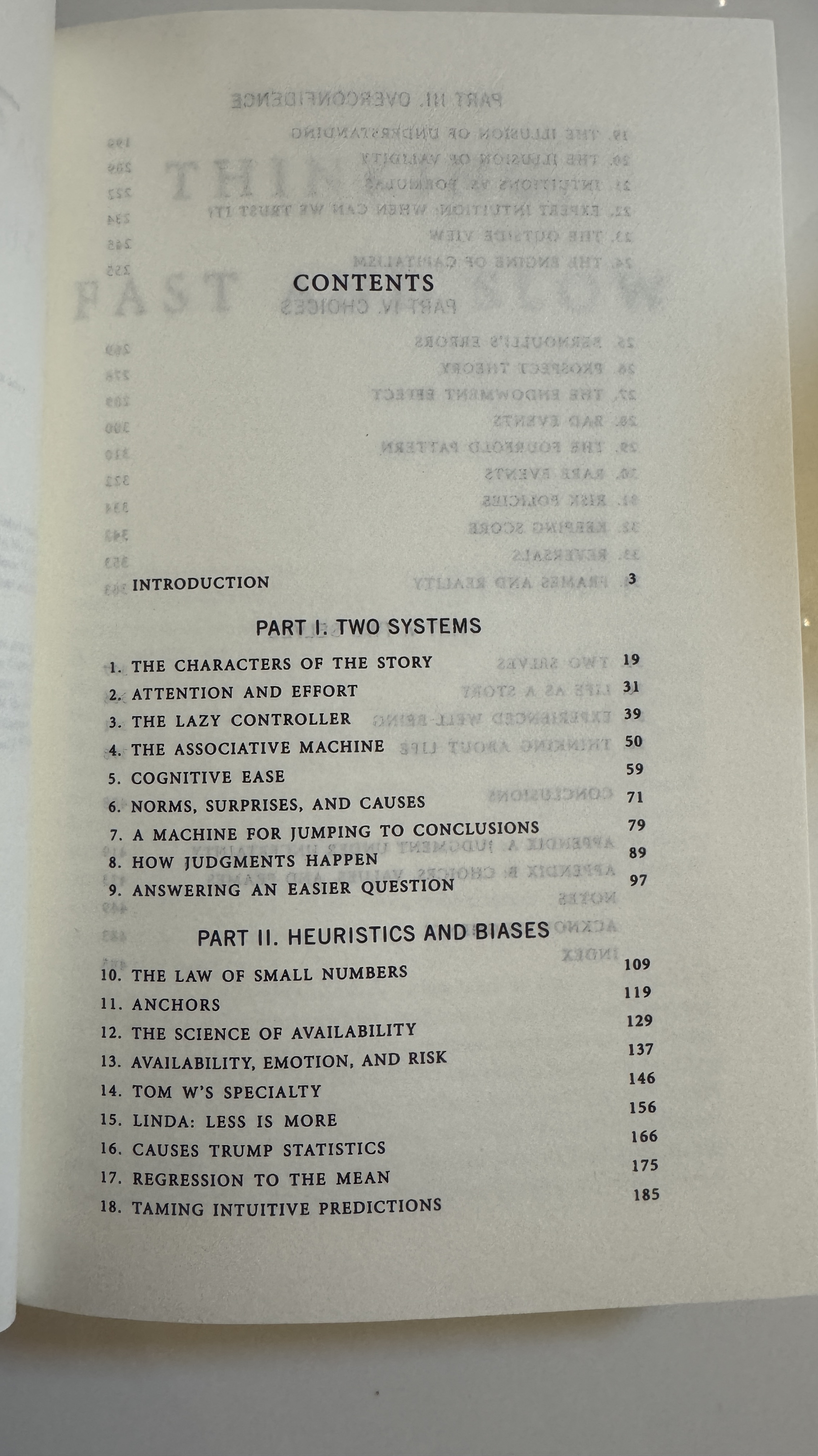 - 저자는 왜 인간이 통계적인 지식을 바탕으로 사고하기 어려운지 설명하기 위해, 한국어로는 어림짐작이라고 번역할 수 있는 휴리스틱(Heuristic)과 편향(Bais)에 대해서 얘기한다. 앞에서 말한 시스템 1은 새로운 것을 창조해서 사고하는 능력이 없기 때문에 항상 기존에 겪었던 경험이라는 안경을 통해서 들어오는 정보를 해석한다. 그래서 새로운 정보가 들어오면 이를 완전히 새로운 것으로 받아들이지 못하고 이미 경험했댄 것을 빗대어 사고 한다는 것이다. 이를 설명하기 위해 다음과 같은 몇가지 이론들과 예시들을 설명하여 준다. Anchoring, Availability, Conjunction fallacy, Optimism and loss aversion, Framing, Sunk cost. Anchoring은 협상이나 추정에 있어서 최초로 주어진 협상안이나 추정치에서 크게 벗어나지 못하고 약간의 수정만 하는 현상을 말한다. Availability는 사람이 과거의 어떤 현상이나 경험에 대해서 평가를 할 때, 연관된 지표가 아닌 '기억해 내기 쉬움'에 따라 결정되는 현상을 말한다. Conjuction fallacy는 인간이 사고를 할 때 스스로이든 타인에 의해서이든 어려운 문제를 질문 받을 때 이를 직접적인 정보를 찾아서 답을 하는 것이 아닌 접근하기 쉬운 정보로 질문을 자동적으로 변형시켜서 답을 찾는 현상을 말한다. Optimism and loss aversion이란 인간이 인지적으로 하는 낙관적인 편향을 말한다. 통계적인 데이터에도 불구하고 인간은 자신도 모르게 자신의 경우에는 낙관적인 '행운의 경우'를 적용하게 되는 현상을 설명하는 것이다. Framing이란 같은 정보를 어떻게 전달하느냐에 따라서 그에 대한 반응이 완전히 바뀌는 것을 일컫는데, 예를 들어 '10% 치사율'과 '90%의 생존율'이라는 같은 정보를 가지고 이를 분리해서 하나만 전달하게 되면 전자는 부정적인 반응과 피하려는 경향이 나타나고 후자는 긍정적인 반응과 시도해 보려는 경향이 나타나는 것이다. Sunk cost란 경제학에서 말하는 매몰비용으로 이미 회수가 불가능한 기존 투자비용(돈이든 에너지이든 시간이든) 때문에 계속적으로 손해보는 투자를 이어나가는 현상을 말한다.