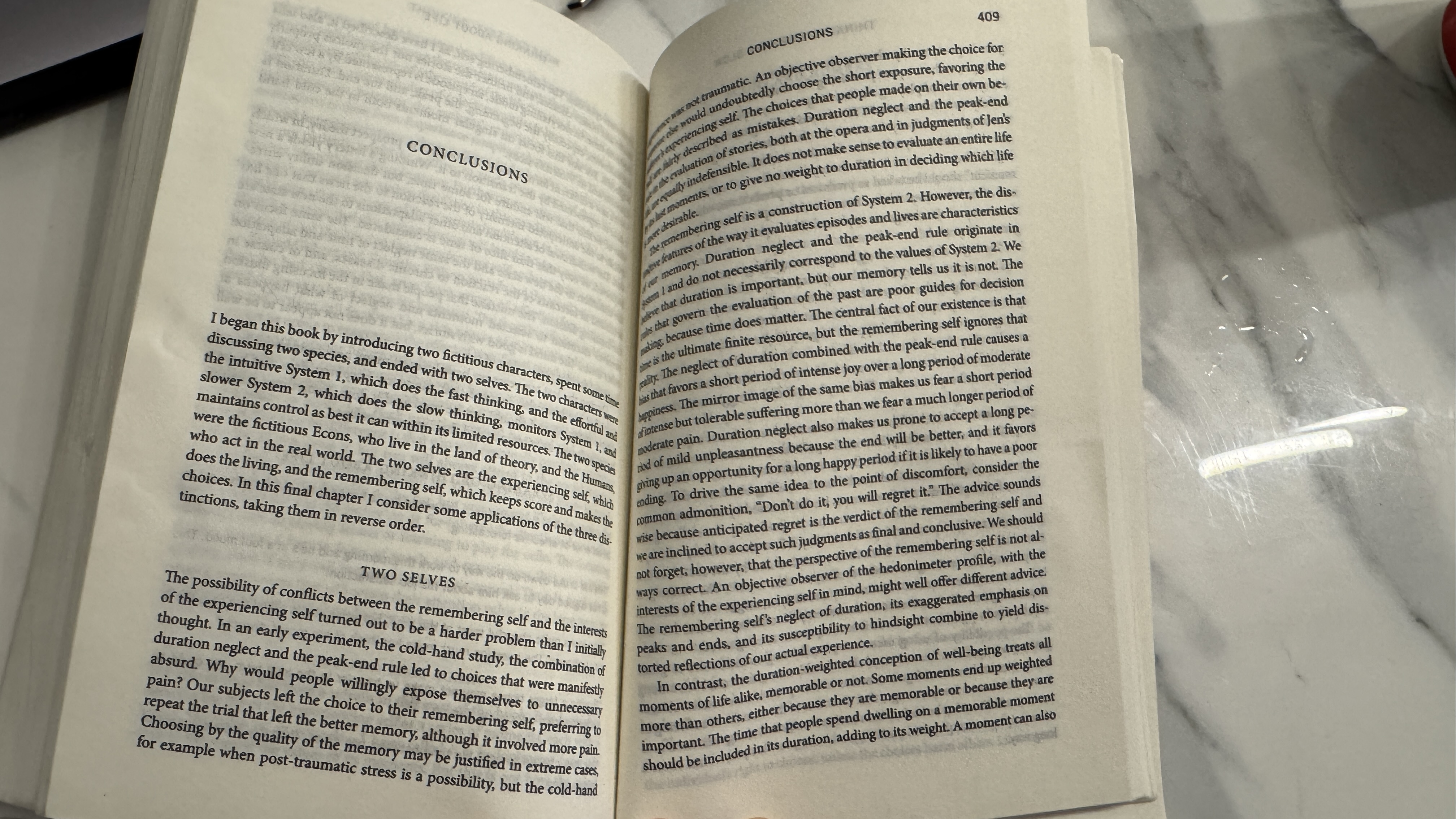 - 이 마지막 파트도 굉장히 흥미로운 내용인데, 인간에게는 경험하는 자아(exeperiencing self)와 기억하는 자아(remembering self)라는 두가지의 개별적인 내적자아가 존재한다는 것이다. 특히 행복과 고통을 측정하는데 있어서 실제의 경험한 고통과 행복의 절대적인 양보다는 그것을 ‘기억하는 방식’이 더 중요하게 작용하는데, 이 기억하는 자아의 가장 특이한 성질들은 ‘지속기간 무시’, ‘최고점과 끝점의 절대적 영향’등이 있다는 것이다. 예를 들어, 10분동안의 일정한 고통보다 동일한 시간동안 더 적은 고통에서 점점 증가하여 평균적으로는 결국 같은 고통을 느끼게 되는 두번째 경우를 더 고통스럽다고 기억하게 되는 것과 더불어, 심지어 고통의 시간이 더 길더라도 마지막에 더 작은 고통을 느끼게 되면 오히려 실험자들을 더 길지만 적은 고통으로 끝나게 되는 하지만 절대적인 고통의 양은 더 큰 옵션을 선택하게 된다는 것이다. 이는 사람의 내면에 마치 그때 그때를 경험하는 자아와 함께 이를 기억하는 자아가 따로 존재하는 (시스템 1과 시스템 2가 존재하는 것과 같이) 것과 같은 현상을 말하는 것이다.