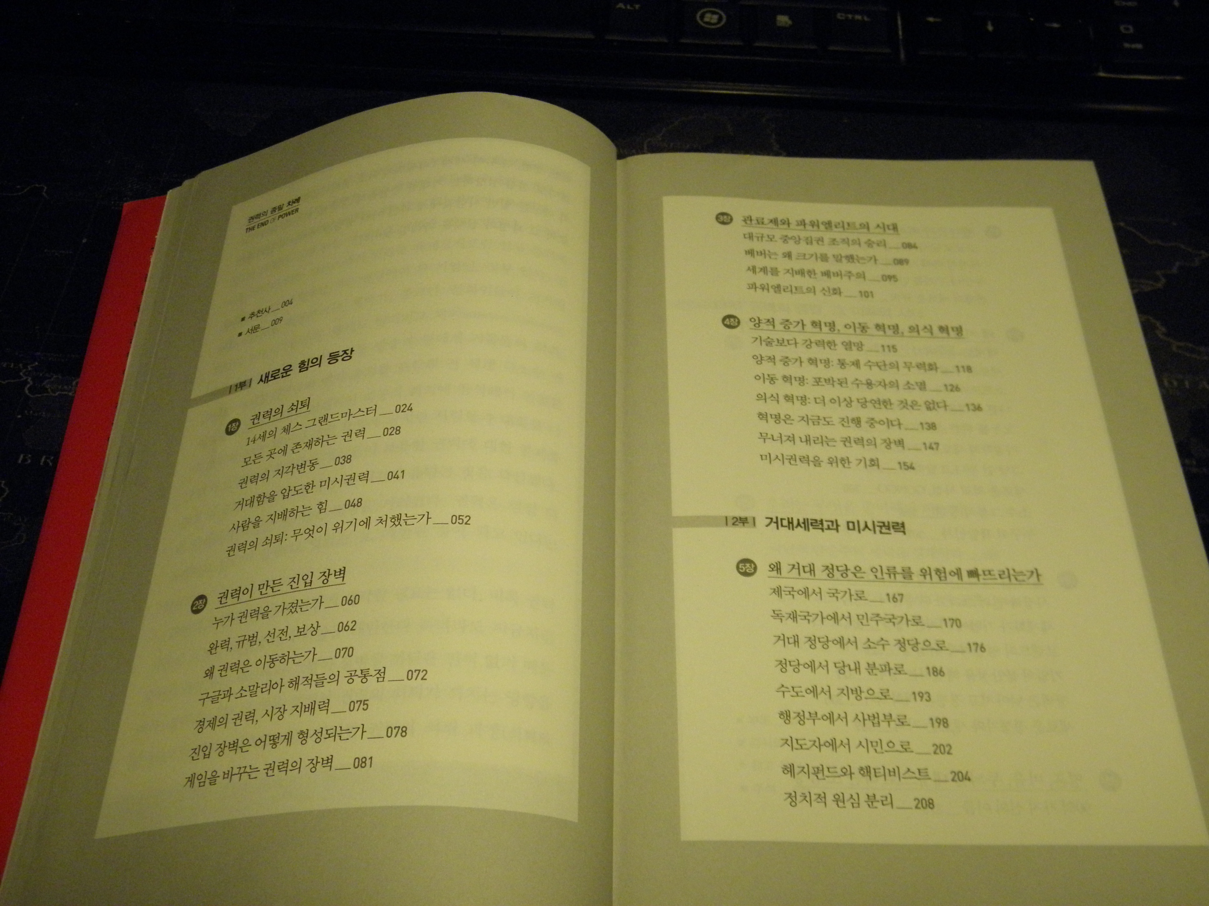 책은 1부는 새로운 힘의 등장, 2부는 거대세력과 미시세력, 3부는 권력의 종말, 그 이후의 시대로 구분되어 있다. 1부에서 저자는 기존의 권력들이 어떻게 쇠퇴해가고 있으며 기존의 거대 권력들이 얼마나 무기력해져가고 있는지에 대해서 여러가지 사례를 들어가면서 얘기한다. 그리고 이러한 권력의 쇠퇴는 3가지 혁명, 즉 양적 증가 혁명, 이동 혁명, 의식 혁명에 의해서 진행되었다고 설명한다.