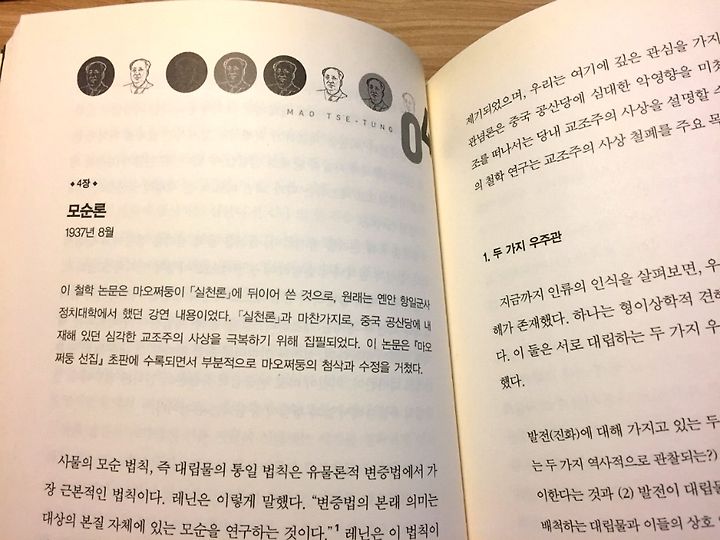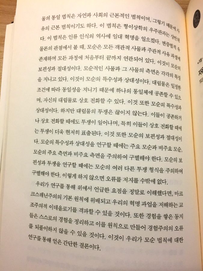 예전에 인터넷에서 '죽기 전에 꼭 읽어보아야 할 책 100선'이라는 list를 본 적이 있는데, 거기서 처음 모택동의 <모순론>이라는 책의 존재를 알게 되었다. 그러다가 지난번 한국 휴가 때 부모님집 책장에서 이 책이 이미 집에 있었던 것을 발견하고 중국으로 가져와 읽게 되었다.