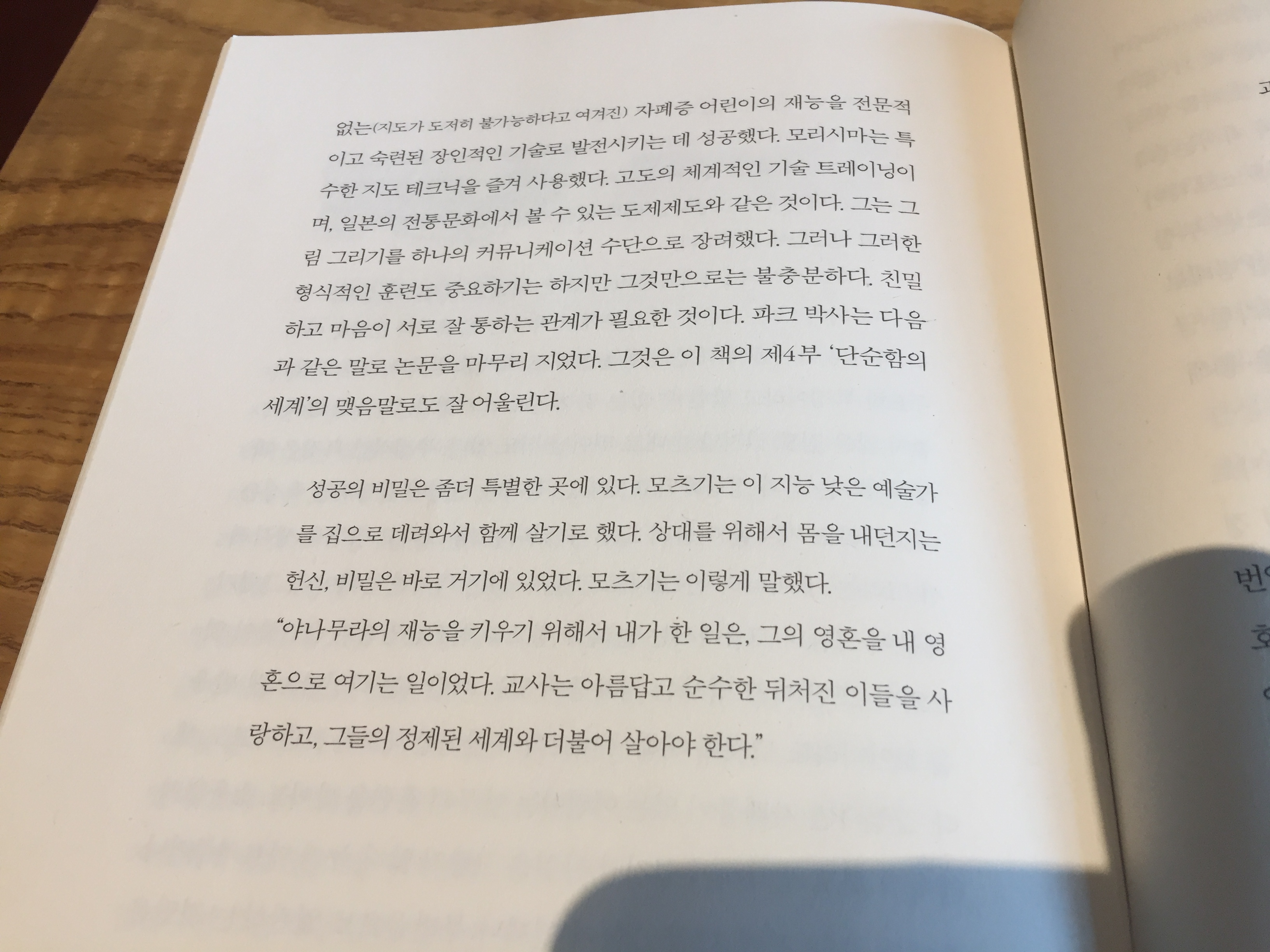 "야나무라의 재능을 키우기 위해서 내가 한 일은, 그의 영혼을 내 영혼으로 여기는 일이었다. 교사는 아름답고 순수한 뒤처진 이들을 사랑하고, 그들의 정제된 세계와 더불어 살아야 한다."