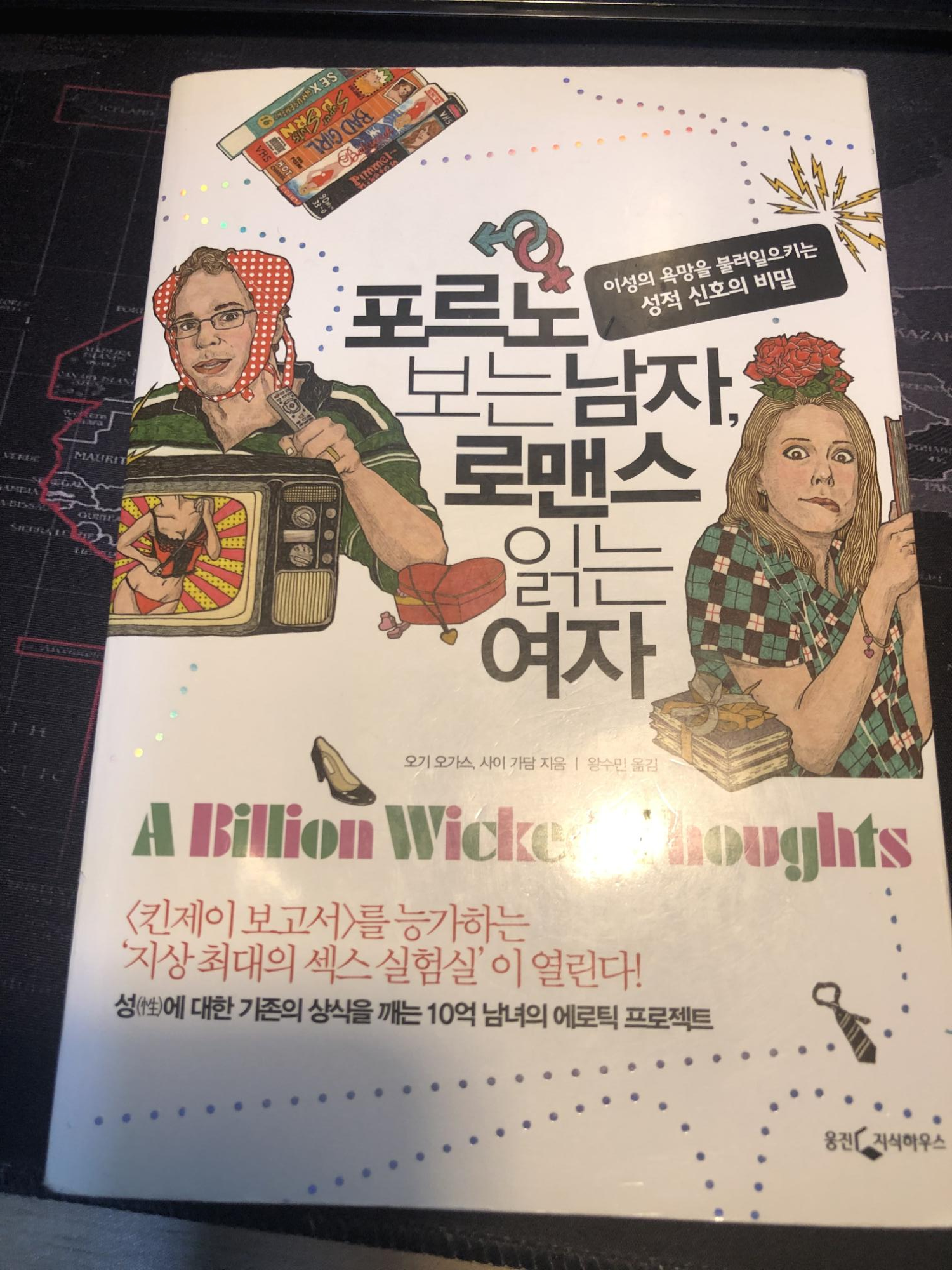 오기 오가스(Ogi Ogas)와 사이 가담(Sai Gaddam)의 [A bilion wicked thoughts] 라는, 직역하자면 '수많은 짓궂은 생각들'이라는 책은 [포르노 보는 남자, 로맨스 읽는 여자]라는 더욱 묘사적인 제목으로 번역되어진 책이다. [화성에서 온 남자, 금성에서 온 여자]와 비슷한 류의 책이라고 생각하면 될 듯 하기도 한데, 특이한 것은 이 책의 저자들이 심리학이나 생리학자들이 아닌 모델링을 통한 생물학적 예측을 하는 공돌이에 가까운 사람들이라는 것이다.